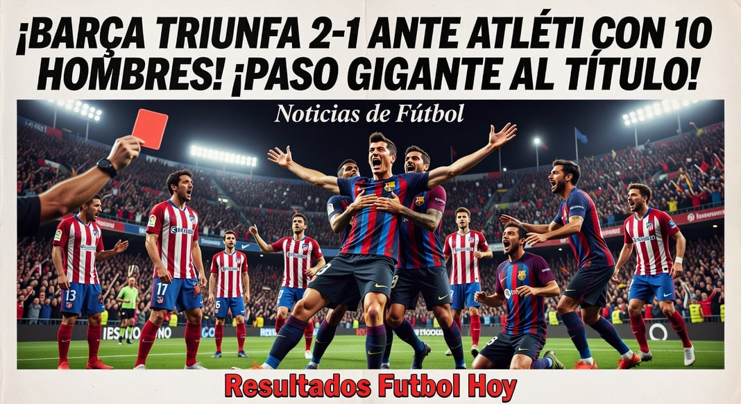 Barcelona se acercó más a la retención del título de LaLiga tras una victoria 2-1 de visitante ante un Atlético de Madrid que jugó con 10 hombres durante todo el segundo tiempo, aprovechando el tropiezo previo de Real Madrid.