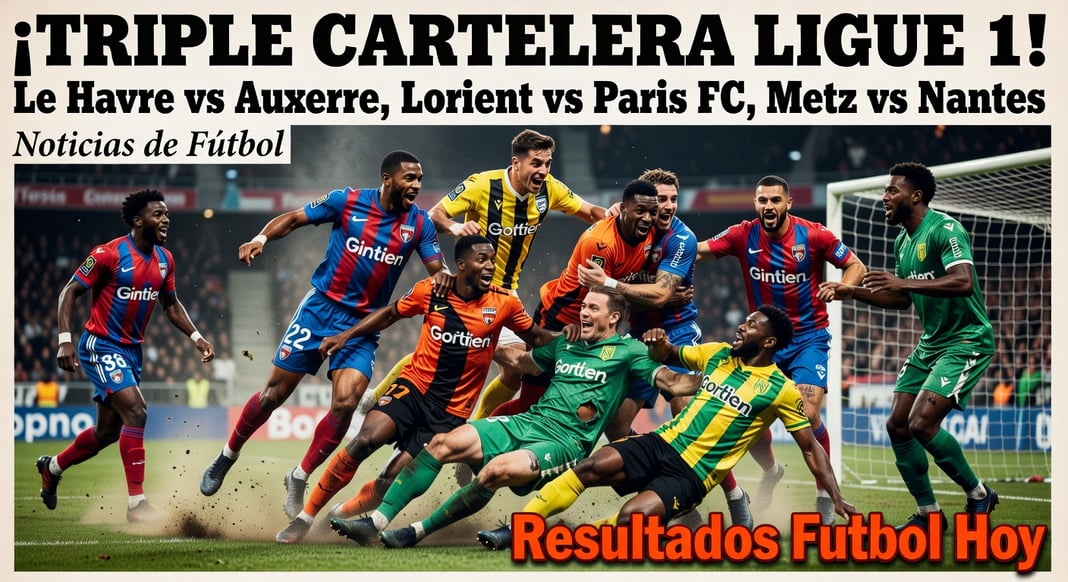 Tres partidos de la Ligue 1 arrancan simultáneamente a las 16:15 GMT: Le Havre vs Auxerre en el Stade Océane, Lorient vs Paris FC en el Stade du Moustoir y Metz vs Nantes en el Stade Saint-Symphorien. Sigue los Resultados Futbol Hoy de estos emocionantes encuentros de la liga francesa.