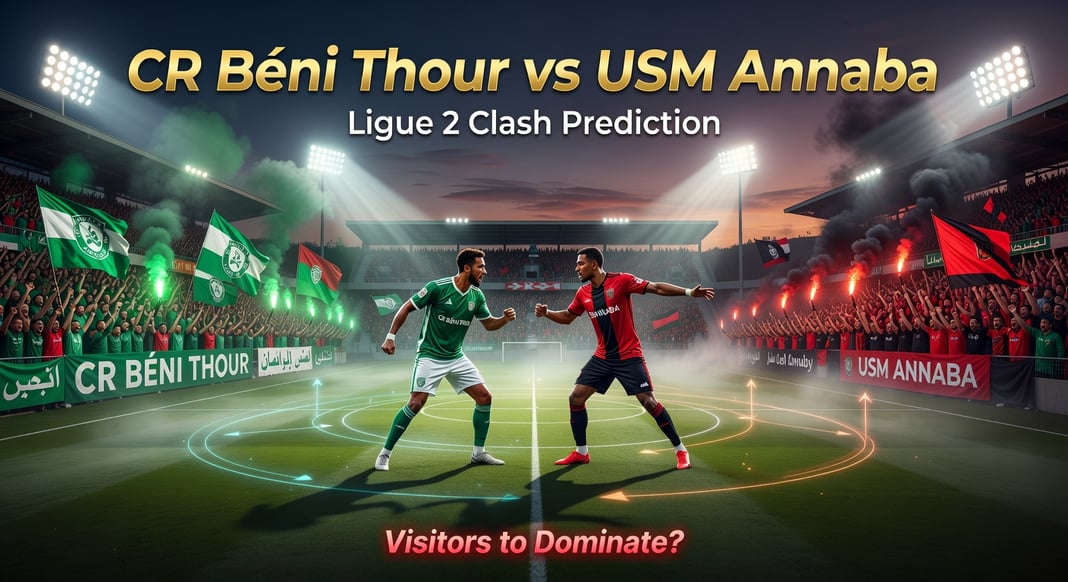 CR Béni Thour’s last five matches have been tough: losses to AS Khroub (0-2), JS Bordj Ménaïel (0-1), and mixed draws or low wins, sitting 10th-13th with a leaky defense (21 goals conceded in 24 games). USM Annaba contrasts sharply: WWLWD including a 2-1 away win at IB Khemis El Khechna and 1-0 home vs Chelghoum, holding 6th place with +18 goal difference. Tactically, hosts favor long balls and home counters but struggle with possession (under 45% average), while USM controls midfield (Yahia-Benkouider) for 55%+ ball, breaking via Kerssani’s left-wing runs – expect visitors to dominate and frustrate CR’s attacks into a controlled affair.